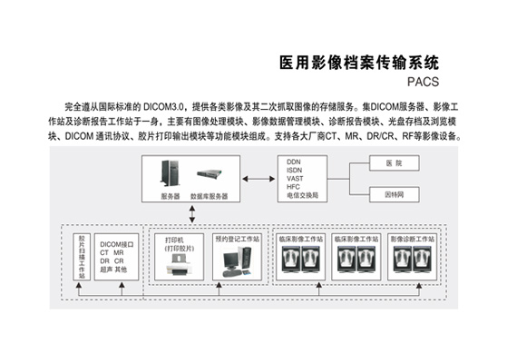 PACS醫(yī)用影像檔案傳輸系統(tǒng)完全遵從國際標(biāo)準(zhǔn)的DICOM3.0版本,提供各類影像及其二次抓取圖像的存儲服務(wù)。它集DICOM服務(wù)器,影像工作站及診斷報(bào)告工作站于一身,主要有圖像處理模塊、影像數(shù)據(jù)管理模塊、診斷報(bào)告模塊、光盤存檔及瀏覽模塊,膠片打印輸出模塊等功能模塊組成,支持各大廠商CT、MRI、DR/CR、RF等影像設(shè)備。