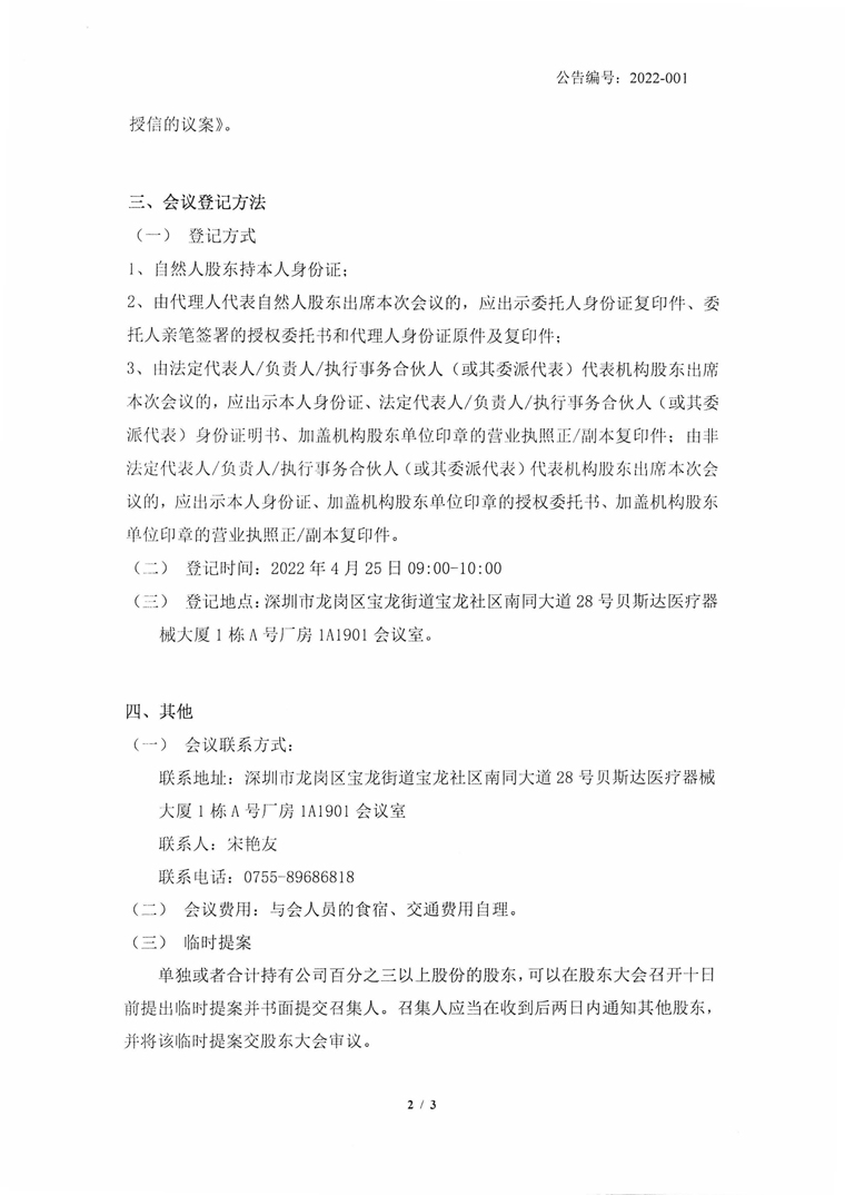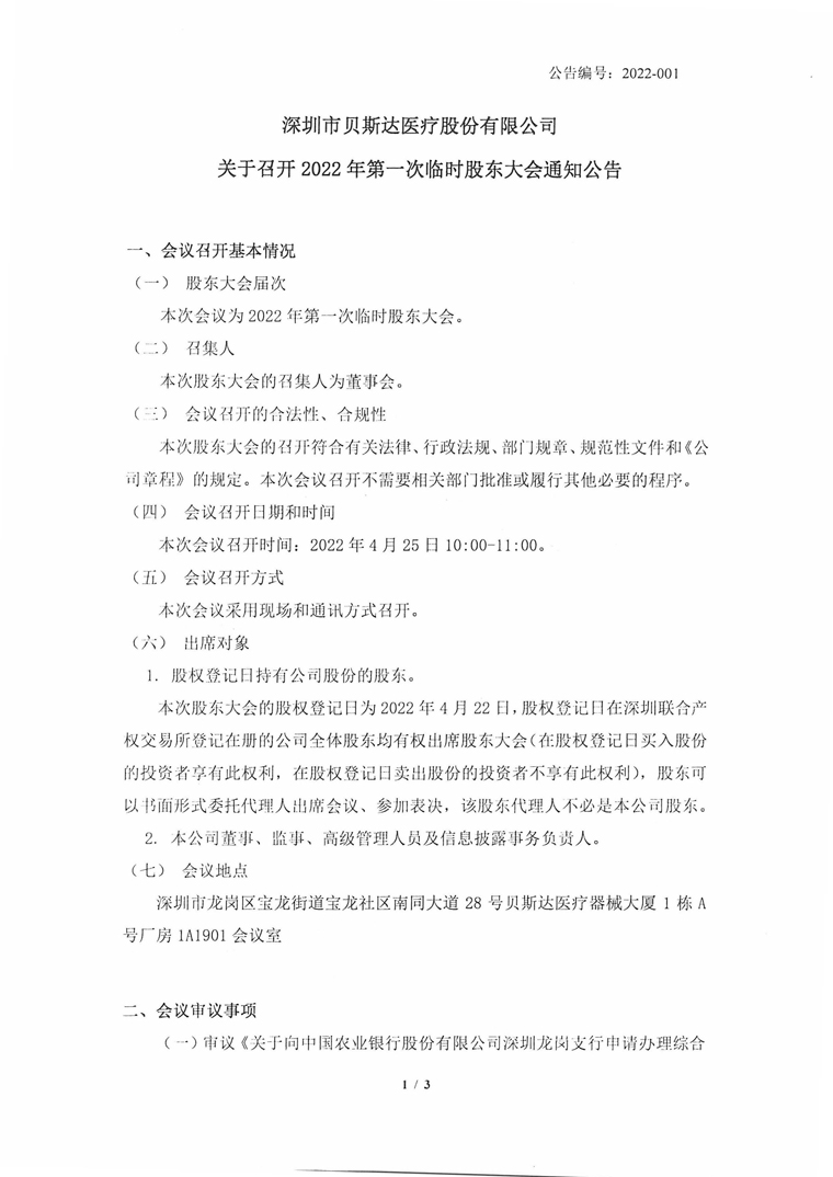 2022-001-貝斯達-關于召開2022年第一次臨時股東大會通知公告
