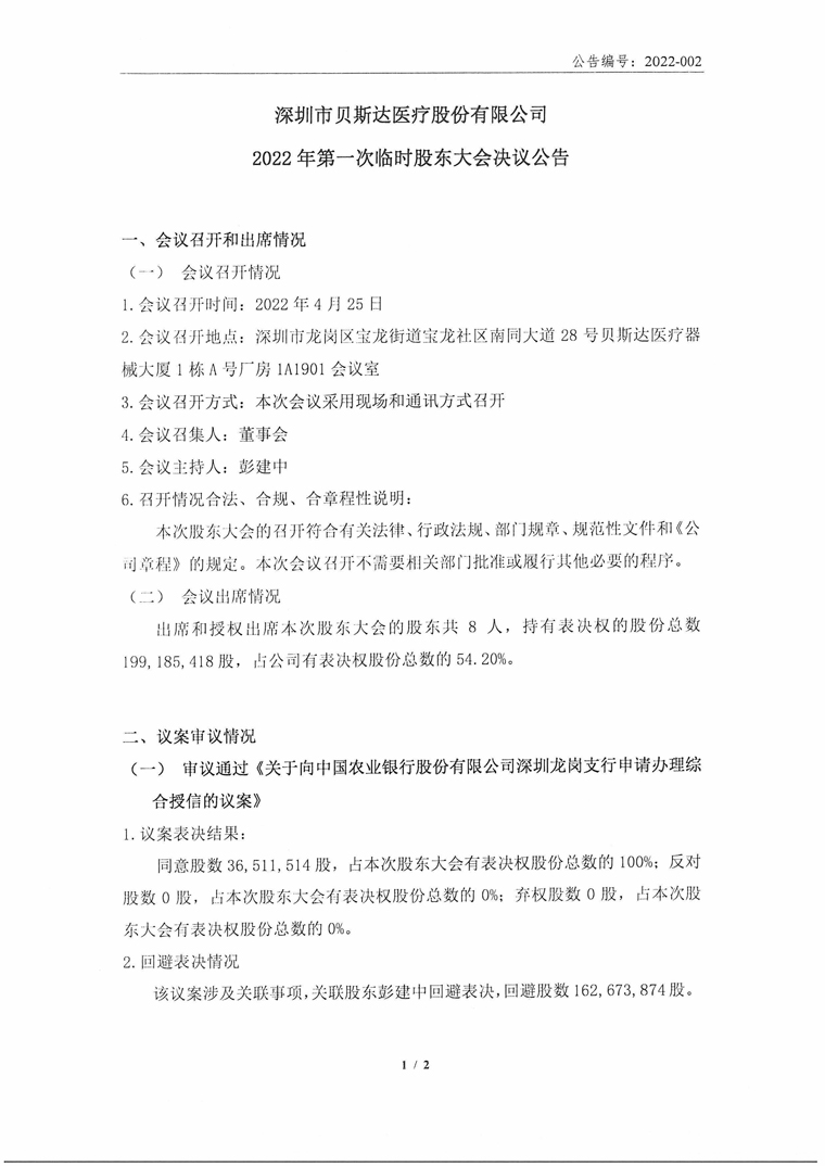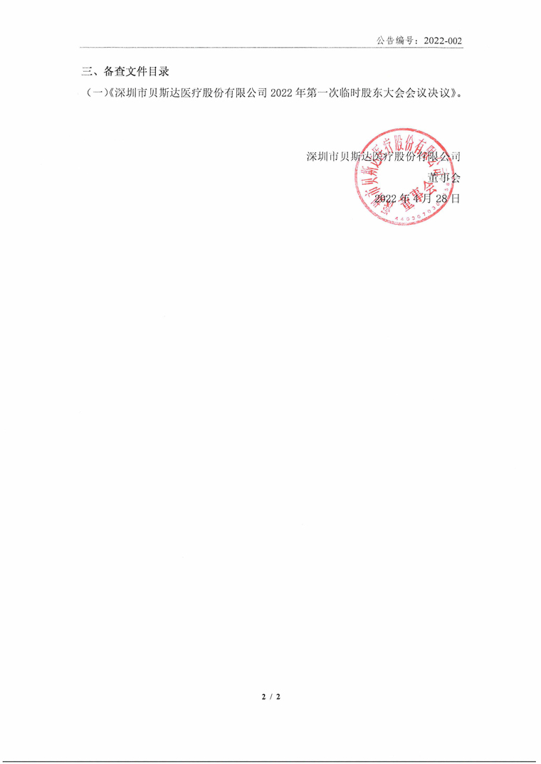 2022-002-貝斯達-2022年第一次臨時股東大會決議公告