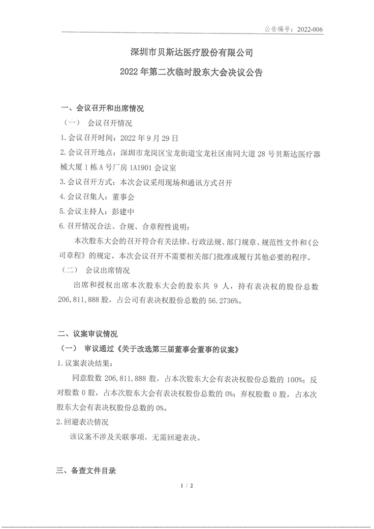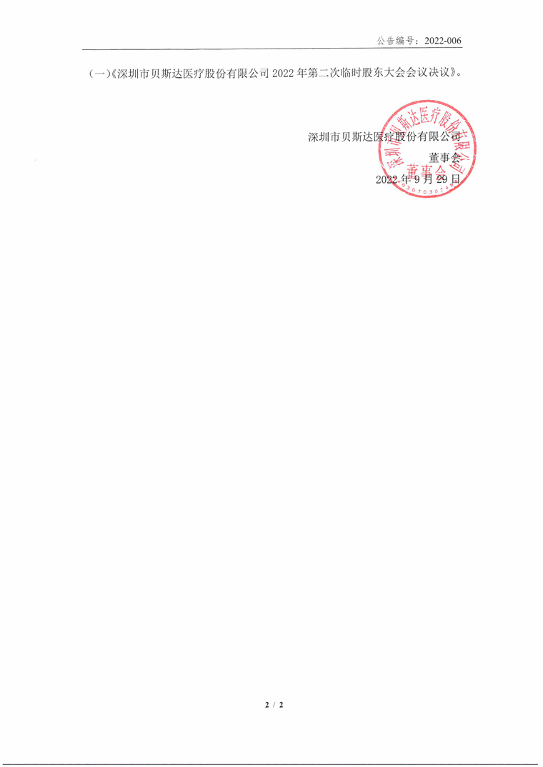 2022-006-貝斯達(dá)-2022年第二次臨時(shí)股東大會(huì)決議公告